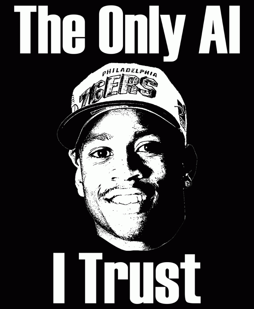 Are you skeptical about the capabilities of artificial intelligence, but are simultaneously a fan of the American athlete Allen Iverson? Well, that’s why I created the logo on the left over there – to give others the chance to show their love for the real AI. The only AI who’s ever worn the number three, the only AI to hold the record for most minutes played per game in a single season, and the only AI with the most career points per game in the playoffs. If you want to join me in showing love for the fear of the future, please follow this link to get your own.